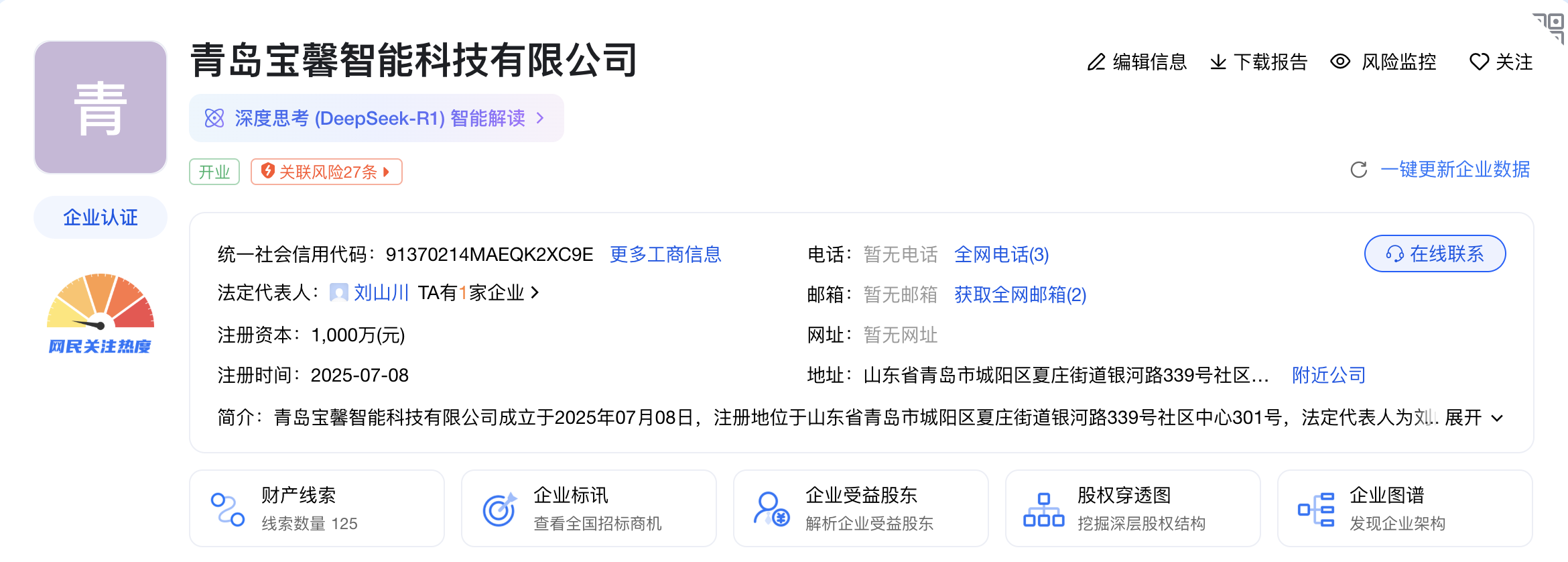 公开材料显示,近日,青岛宝馨智能科技无限公司成立,代表报酬刘山水,